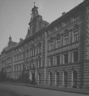 Landtagsgebäude in der Prannerstraße Nr. 20 (mit Nebengebäuden in Nr. 19 und 21) mit Fassade im Stil der deutschen Renaissance, 1912. Der Bau wurde im Zweiten Weltkrieg durch Bombentreffer in der Nacht vom 24. auf den 25. April 1944 so stark zerstört, dass nach dem Krieg ein Wiederaufbau als Landtagssitz unterblieb. (Bayerische Staatsbibliothek, Bildarchiv port-025979)