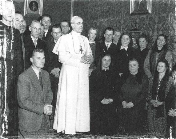 Eine Pilgergruppe versammelt sich um Papst Pius XII. (1856-1958) in Rom. (Archiv des Erzbistums München und Freising)