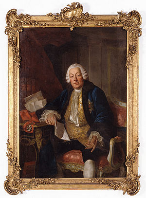 Philipp Andreas Freiherr (ab 1762 Reichsgraf) von Ellrodt (1707-1767) war leitender Minister unter Markgraf Friedrich (reg. 1735-1763). Aus seinem Erbe mütterlicherseits stammte das Gut Neudrossenfeld, das er repräsentativ ausbauen ließ. Kupferstich von 1767. (Österreichische Nationalbibliothek PORT_00124925_01)
