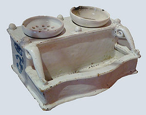 Schreibzeug mit Tintenfass und Streusandbüchse aus der markgräflichen Kanzlei. Bayreuther Fayencen, um 1750/60. (Historisches Museum Bayreuth)