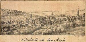 Stadtansicht von Neustadt an der Aisch von 1835. Zeichnung von W. Rothe. Abb. aus: Georg Ludwig Lehnes, Geschichte der Stadt Neustadt a.d. Aisch, Neustadt a.d. Aisch 1835, Fontispiz (Bayerische Staatsbibliothek, Bavar. 1639 n)