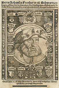 Johann Freiherr von Schwarzenberg (1463-1528) war unter Markgraf Kasimir (reg. 1515–1527) Hofrat und Landhofmeister. Er half mit beim Verfassen der Straßprozessordnung und war ein früher Anhänger Luthers. Holzschnitt von Hans Weiditz (c. 1500-1536). Abb aus: Marcus Tullius Cicero/ Johann Neuber/Johann von Schwarzenberg, Officia, Augsburg 1531, Widmungsbild. (Bayerische Staatsbibliothek, Res/2 A.lat.b. 347)