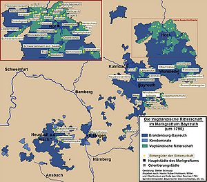 Die Vogtländische Ritterschaft im Markgraftum Bayreuth (um 1790). (Gestalung: Stefan Schnupp; Angaben u.a. nach: Hanns Hubert Hofmann, Mittel- und Oberfranken am Ende des Alten Reiches 1792, München 1954; Spindler/Diepolder, Bayerischer Geschichtsatlas, 25)