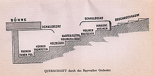 Querschnitt durch das Bayreuther Orchester. Abb. aus: Wolfgang Golther, Bayreuth, Berlin/Leipzig 1904, nach S. 80. (Bayerische Staatsbibliothek, L. eleg. G. 397 lt-2)