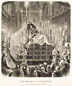 Aufbahrung König Maximilians II. von Bayern (1864) nach einer Zeichnung von Karl Appold (1840-1884). Abbildung aus: Hans Heidelbach, Luitpold, Prinz-Regent von Bayern, München 1901, 118. (gemeinfrei via Wikimedia Commons)