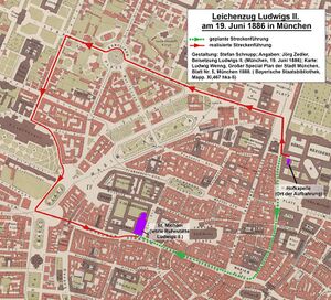 Erst als nacheinander die Münchner Polizeidirektion und die Kreisregierung warnten, dass die Route dem Publikumsandrang nicht gerecht werde und Störungen, Ausschreitungen oder gar Durchbrechungen von Absperrungen nicht zu vermeiden seien, setzte ein Umdenken ein: 24 Stunden vor dem feierlichen Cortège vom 19. Juni wurde eine veränderte Streckenführung veröffentlicht, mit mehr als zweieinhalbfacher Ausdehnung der ursprünglichen Variante. Die neue Route führte von der Residenz über Briennerstraße und Königsplatz und von dort über die Arcis- und die Sophienstraße, den Karlsplatz und die Neuhauserstraße nach St. Michael. Gegenüber der Erstplanung hatte sich die Wegstrecke mit 2,5km fast verdreifacht und bot somit weit mehr Zuschauern Platz. Es lag mithin keineswegs am Zeremoniell, dass sein Leichenzug in der Literatur immer wieder als besonders bemerkenswert dargestellt wird. Die verlängerte Strecke entsprach viel eher den üblichen Gepflogenheiten; außergewöhnlich wäre im Gegenteil die zunächst geplante kurze Variante gewesen. Vielmehr war es das massive öffentliche Interesse in Kombination mit einer bis dato unerreicht intensiven medialen Berichterstattung und der unmittelbar einsetzenden Mystifizierung Ludwigs II., die das Ereignis von früheren Monarchenbeisetzungen abhoben.