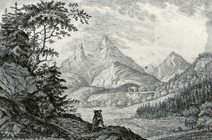 Tal der Berchtesgadener Aache vor Gründung des Klosters um 1100, Stahlstich von einem unbekannten Künstler um 1816. Erstpublikation in: Zeitschrift für Baiern und die angrenzenden Länder 3 (1816), 126-128. (Stadtarchiv Bad Reichenhall)