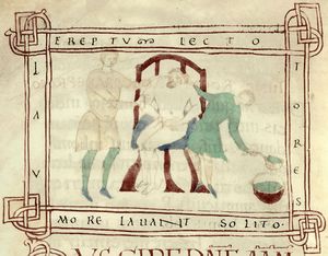 Konkrete Quellen für die Leichenwaschung finden sich erst relativ spät und in monastischem Kontext. Die Consuetudines von Cluny im 11. Jahrhundert geben vor, dass der Rang der Waschenden dem Rang des Verstorbenen entspreche. Diese Vorstellung ist auch in älteren Quellen zu greifen, etwa wenn der "Vita quarta" zufolge der gemarterte Leichnam des Bonifatius erst bei der Waschung durch Erzbischof Lull zu bluten aufhörte. Ob andere Elemente des cluniazensischen Bestattungsritus älteren Ursprungs sind, wie dies etwa für die Bettung des sterbenden Mönchs auf ein Bußgewand ("cilicium") und auf ausgestreute Asche angenommen wurde, ist durch die Quellen nicht zu belegen. Allerdings war der Brauch bereits weiter verbreitet, wie die Vita Ulrichs von Augsburg um 990 belegt, der im Sterben auf den mit Weihwasser besprengten und mit einem Aschekreuz versehenen Boden gelegt worden sei.