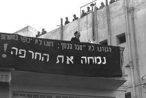 Der israelische Politiker Menachem Begin (1913-1992) war einer der entschiedensten Gegner des Abkommens. Hier auf einer Kundgebung in Jerusalem am 25.2.1952. (Gemeinfrei via Wikimedia Commins)