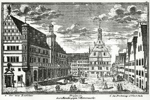 Stich des Rothenburger Marktplatzes mit Sicht auf das Rathaus. ...