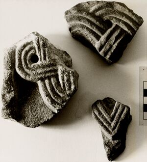 Linker und rechter Abschnitt eines langen Balkens. Fundort: Pfarrkirche ...