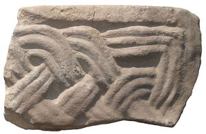 Fragmentierter Balken mit durchbrochenem Aufsatz und durchlochter Leiste vor ...