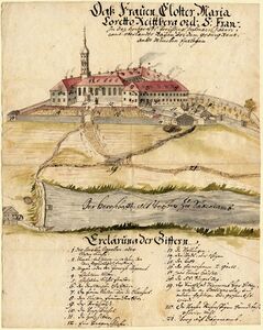 Brauhaus (Nr. 9) und Bierhütte (Nr. 19) beim Franziskanerinnen-Kloster Reutberg (Lkr. Bad Tölz-Wolfratshausen), um 1750. (Archiv des Erzbistums München und Freising, Plansammlung AEM PLS20092)