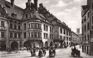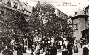 Der Kneiphof des Münchner Hofbräuhauses auf einer Postkarte vom 16. Mai 1916. Abb. aus: Astrid Assél und Christian Huber, München und das Bier. Auf großer Biertour durch 850 Jahre Braugeschichte, 56 oben. (Veröffentlicht mit Genehmigung des Hofbräuhauses München)