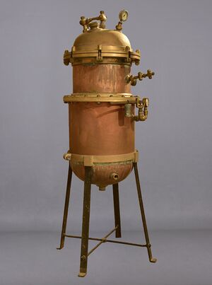 Linde-Kältemaschine (erste an die Drehersche Brauerei gelieferte "Ur-Linde"), 1876; ausgestellt auf der Bühne "Bayern industrialisiert mit Maß" im Museum der Bayerischen Geschichte in Regensburg. (Haus der Bayerischen Geschichte, xxb-00115)