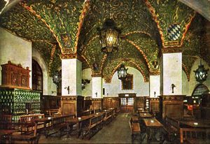 Die Schwemme des Münchner Hofbräuhauses auf einer undatierten Postkarte. Abb. aus: Astrid Assél und Christian Huber, München und das Bier. Auf großer Biertour durch 850 Jahre Braugeschichte, 56 unten. (Veröffentlicht mit Genehmigung des Hofbräuhauses München)