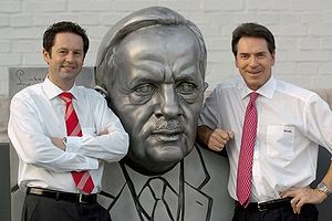 Michael Stoschek (rechts) übergibt Ende 2005 nach 34 Jahren den Vorsitz der Geschäftsführung an Jürgen Otto. Es ist das bis dato erfolgreichste Geschäftsjahr der Firmengeschichte: Brose erwirtschaftet 2,2 Mrd. € Umsatz und beschäftigt rund 8.900 Mitarbeiter an 37 Standorten in 19 Ländern. (Brose Fahrzeugteile GmbH & Co. Kommanditgesellschaft, Coburg)
