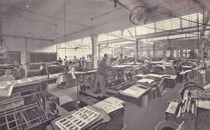 Der Setz-Saal in den Graphischen Kunstanstalten F. Bruckmann. Teil einer Stereoskopie von 1938. (Bayerische Staatsbibliothek, Bildarchiv hoff-69883)
