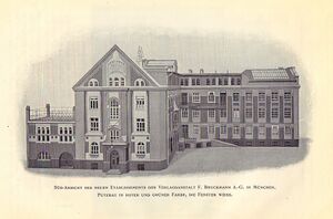 1897 bis 1898 wurde das von Martin Dülfer (1859-1942) entworfene neue Verlagshaus an der Nymphenburger Straße erbaut. Abb. aus: Friedrich Bruckmann, Eine moderne Werkstätte für Buchgewerbe und graphische Reproduktion, München 1900, 6. (Bayerische Staatsbibliothek, Bavar. 490 nd)