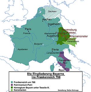 Das im 6. Jahrhundert erstmalig erwähnte bayerische Herzogtum hat sich bis zur Ära Karls des Großen in schwankender Abhängigkeit vom Frankenreich befunden. Inwieweit dieser Eindruck zutrifft oder einer lückenhaften Quellenlage geschuldet ist, lässt sich nicht mit Sicherheit feststellen. Unter der Herrschaft Tassilos III. ist Bayern in hervorstechend autonomer Weise geleitet worden. Manche Historiker sehen darin eine königsgleiche Stellung (etwa Seibert, Art. Tassilo III., 793). Die Machtverhältnisse änderten sich 788 mit dem Sturz Herzog Tassilos. Damit hatten die Karolinger nach Alamannien und Aquitanien ein weiteres Herzogtum beseitigt und eingegliedert. In der nächsten Zeit richtete sich die fränkische Aufmerksamkeit nachhaltig auf Bayern. Karl veranlasste u. a. die Anfertigung mehrerer Besitzverzeichnisse der bayerischen Kirchen und Klöster. Von 791 bis 793 hielt sich der König dauerhaft im ehemaligen Herzogtum auf, vermutlich insbesondere um Widerständen im Land gegen die neue Situation entgegenzutreten. Dass Tassilo III. 794 vor einer Frankfurter Synode unter dem Vorsitz Karls auf seine Herrschaftsrechte eigens verzichten musste, lässt nicht ganz unerhebliche Zweifel der Zeitgenossen an der Legitimität des Vorgangs von 788 noch sechs Jahre danach erkennen. In der folgenden Zeit ebbten die herrscherlichen Bemühungen um eine Einbindung Bayerns spürbar ab, sodass die Integration aus fränkischer Sicht wohl im Wesentlichen erfolgreich vorangeschritten war.