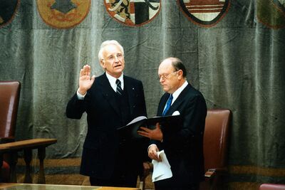 Vereidigung des bayerischen Ministerpräsidenten Dr. Edmund Stoiber durch Landtagspräsident Johann Böhm (geb. 1937) am 29.9.1998. (© Bildarchiv Bayerischer Landtag, Rolf Poss, Bildnr. AA03280A)