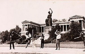 Neben den Völkerschauen wurde die Indianer- und Cowboybegeisterung auch durch Wild-West-Shows gestillt. Ein Paradebeispiel stellt die Show "Buffalo Bill's Wild West" von William Frederick Cody (gen. "Buffalo Bill", 1846-1917) dar, dessen Deutschlandtournee am 19. April 1890 auf der Münchner Theresienwiese beginnt.