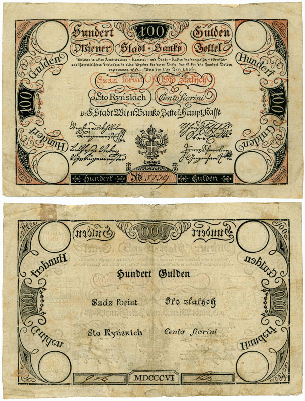 Wiener Bancozettel über 100 Gulden von 1806. Die Banco-Zettel waren das erste Papiergeld in Österreich. In Tirol wurden sie durch eine Währungsrefom 1806 abgeschafft. (Giesecke+Devrient Stiftung Inv.-Nr. AUT-A42a lizenziert durch CC BY-NC-ND 4.0 via bavarikon)