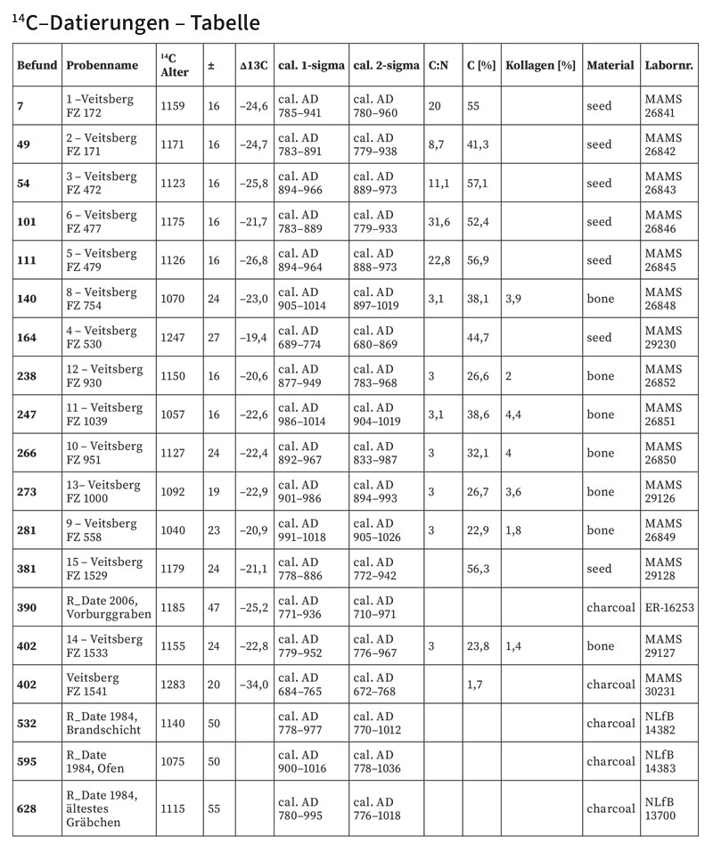 Tabellarische Übersicht der kalibrierten 14C–Datierungen vom Veitsberg. Nach laufender Befundnummer geordnet. (MAMS = Curt–Engelhorn–Zentrum Archäometrie gGmbH, Mannheim; ER = AMS–Labor Erlangen; NLfB = Labor des Niedersächsischen Landesamtes für Bodenforschung). Die Proben ER–16253, Grabung 2006 sowie NLfB–14382, NLfB 14383 und NLfB 13700, Grabung 1984 wurden mit OxCal v4.2.4 Bronk Ramsey (2013) r:5 und IntCal13 atmospheric curve (Reimer et aI. 2013) kalibriert. Die Proben des MAMS wurden mit IntCal13 atmospheric curve (Reimer et aI. 2013)und SwissCal 1.0 kalibriert. (Wolters 2018) HLB
