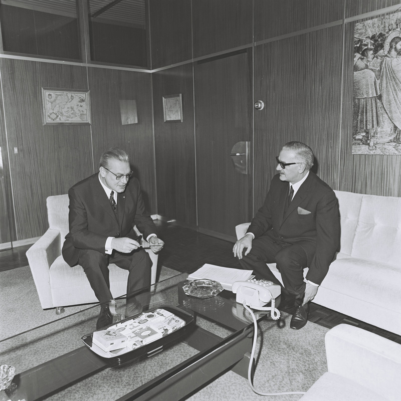Besuch des bayerischen Staatsministers für Bundesangelegenheiten Franz Heubl (CSU, 1924–2001, Staatsminister für Bundesangelegenheiten 1962–1978) bei Regionalpolitikkommissar Albert Borschette (1920-1976, Regionalpolitikkommissar 1970–1976) in Brüssel (Belgien) am 4.12.1971. Foto: Jean-Louis Debaize. (European Communities, 1971) HLB
