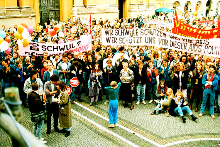 Demonstration gegen den "Maßnahmenkatalog zur Verhütung und Bekämpfung der Immunschwäche AIDS" am 24. Oktober 1987 am Odeonsplatz in München. (Foto: Horst Middelhoff) HLB