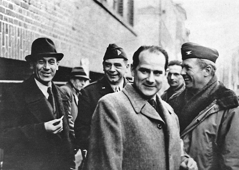 Feier zum einjährigen Bestehen des "Main-Echo" in Aschaffenburg. Von rechts: Colonel Bernhard B. McMahon, Ernest Langendorf (1907-1989), Presseoffizier E. Opitz, Hanns Wetzel (1904-1985). (Main-Echo) HLB