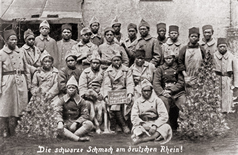 Das 1° Régiment de Chasseurs Malgaches bei einer Feier 1919, vermutlich Weihanchten. Die rassistische Bildunterschrift wurde im Zuge der Kampagne "Die Schwarze Schmarch" hinzugefügt. (Historisches Museum der Pfalz, Foto: Arthur Barth) HLB