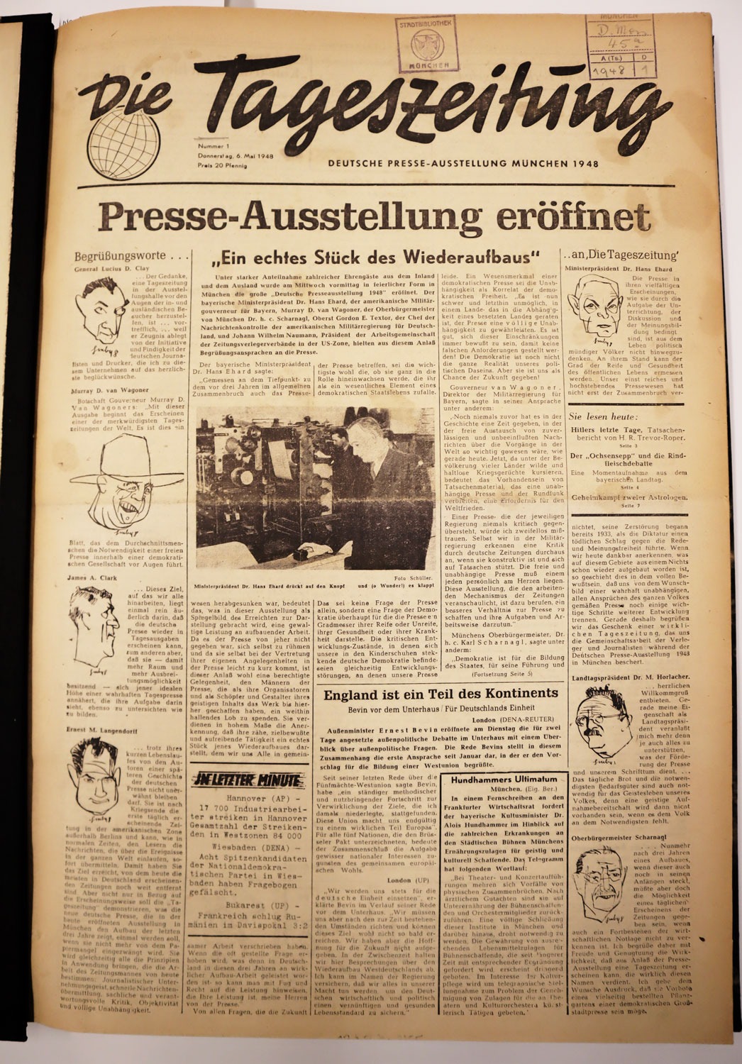 Titelblatt der Erstausgabe der 'Tageszeitung' vom 6. Mai 1948. (Monacensia. Literaturarchiv und Bibliothek)