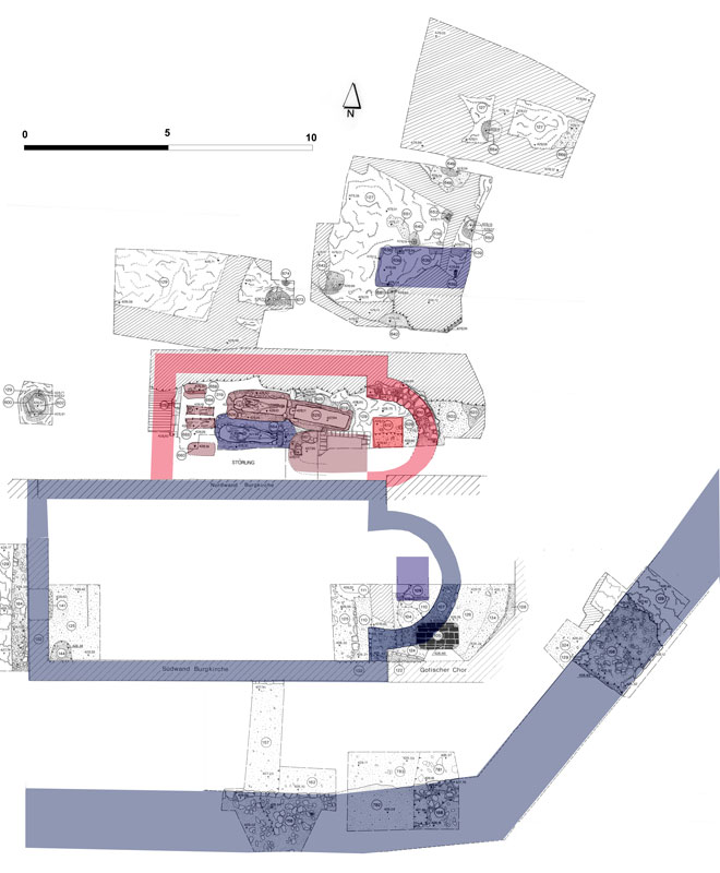Sulzbach-Rosenberg, Untersuchungen im Bereich der ehemaligen Kernburg (1992-2001). Plan der karolingischen Burgkirche mit Adelsfriedhof des 9. bis 11. Jahrhunderts und Memorialkapelle (?). (Mathias Hensch, Uelzen)