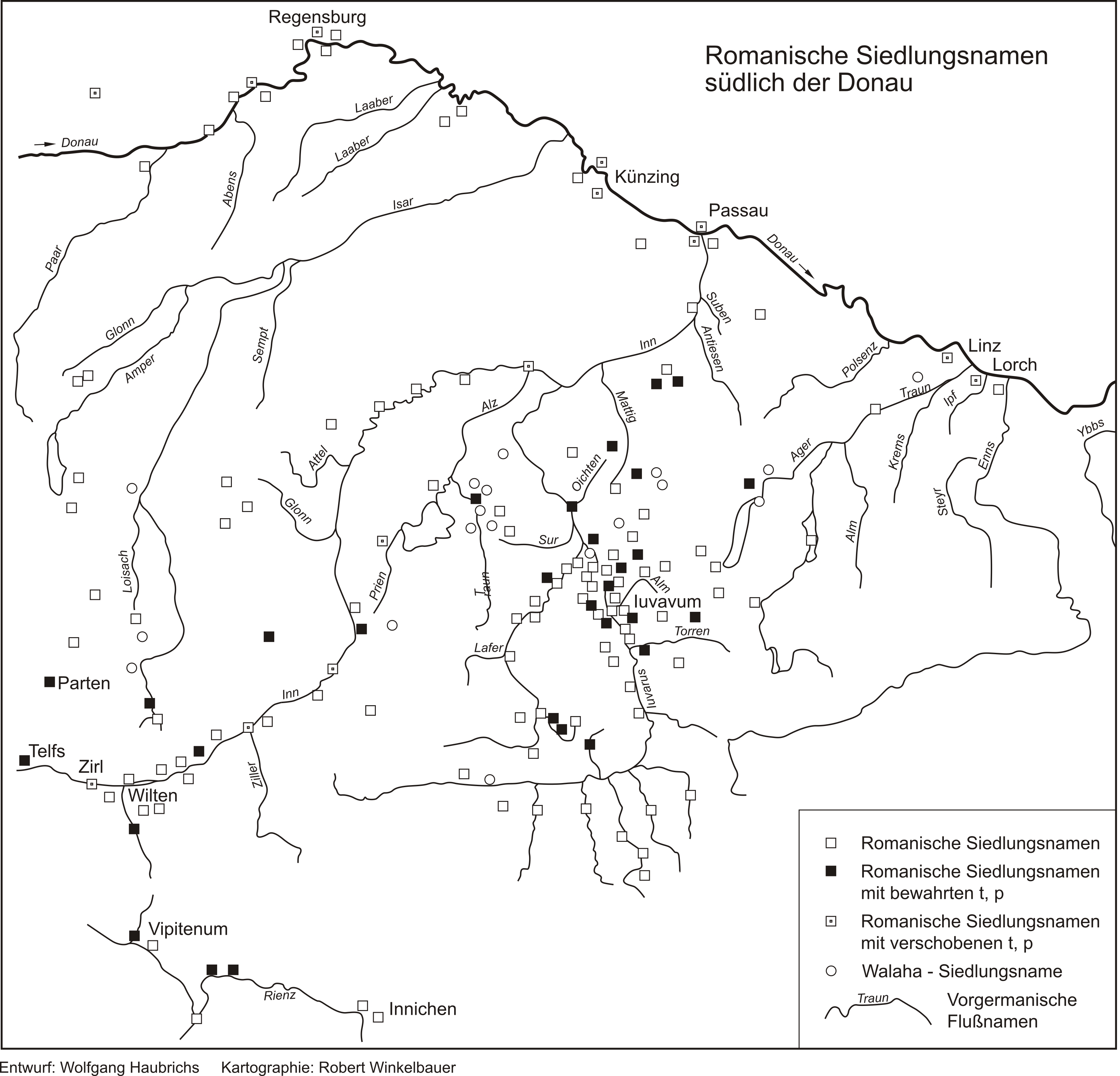 Romanische Siedlungsnamen südlich der Donau. (Entwurf: Wolfgang Haubrichs. Kartographie: Robert Winkelbauer) HLB