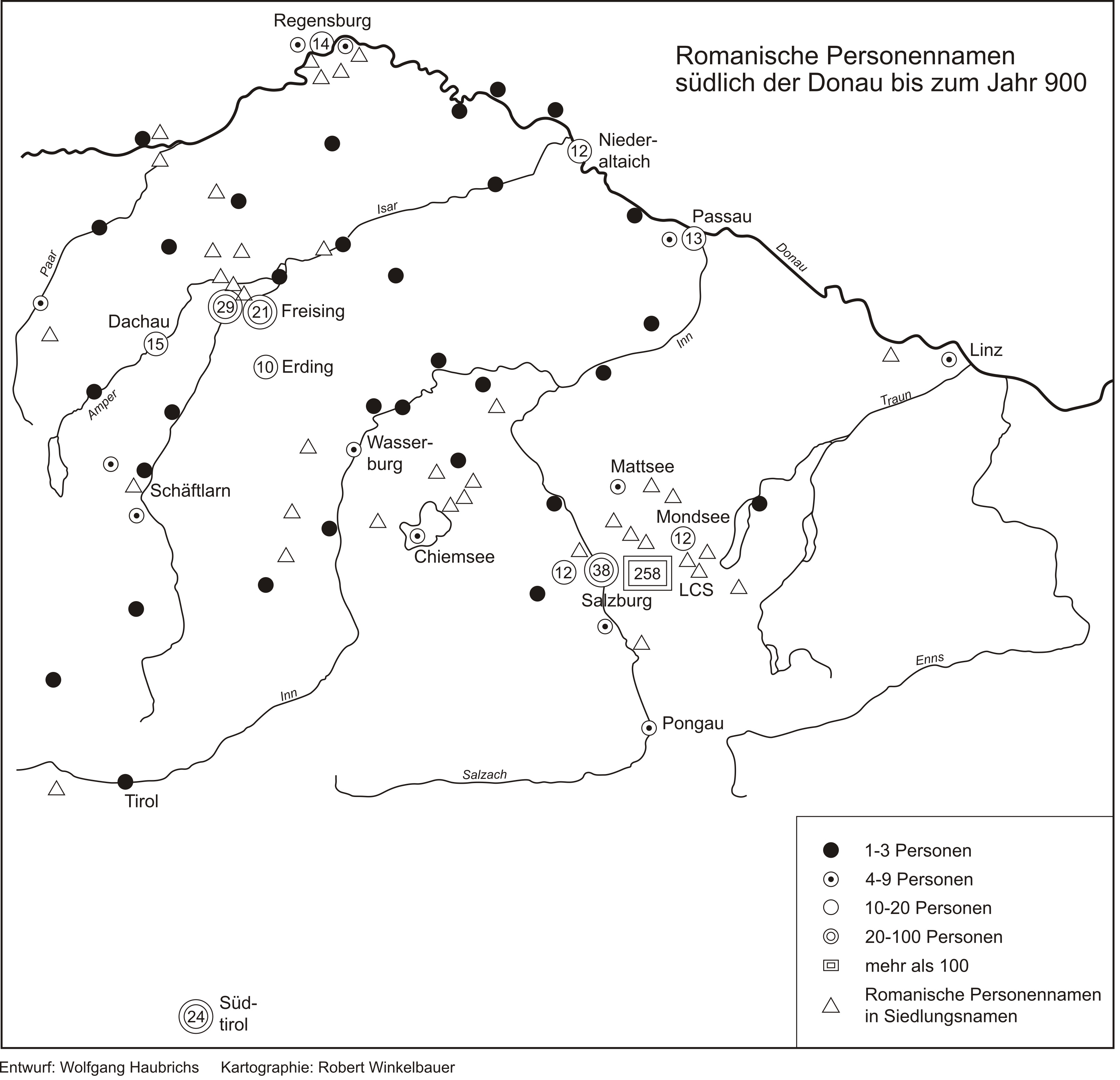 Romanische Personennamen südlich der Donau bis zum Jahr 900. (Entwurf: Wolfgang Haubrichs. Kartographie: Robert Winkelbauer) HLB