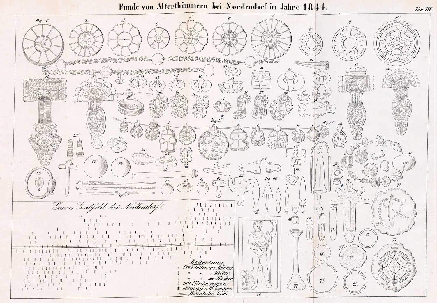 Abb. 4: Auswahl von Funden aus dem Reihengräberfeld von Norden. Links unten der schematische Gräberfeldplan. Illustration zu Johann Nepomuk von Raiser, Fundgeschichte einer uralten Grabstätte bei Nordendorf im Landgerichtsbezirk Wertingen. Abb. aus: Jahres-Bericht des historischen Vereins für den Regierungs-Bezirk von Schwaben und Neuburg 10/11. 1844/45 (1846), Tab. III. (Bayerische Staatsbibliothek, 4 Bavar. 1013 sa-8/11) HLB