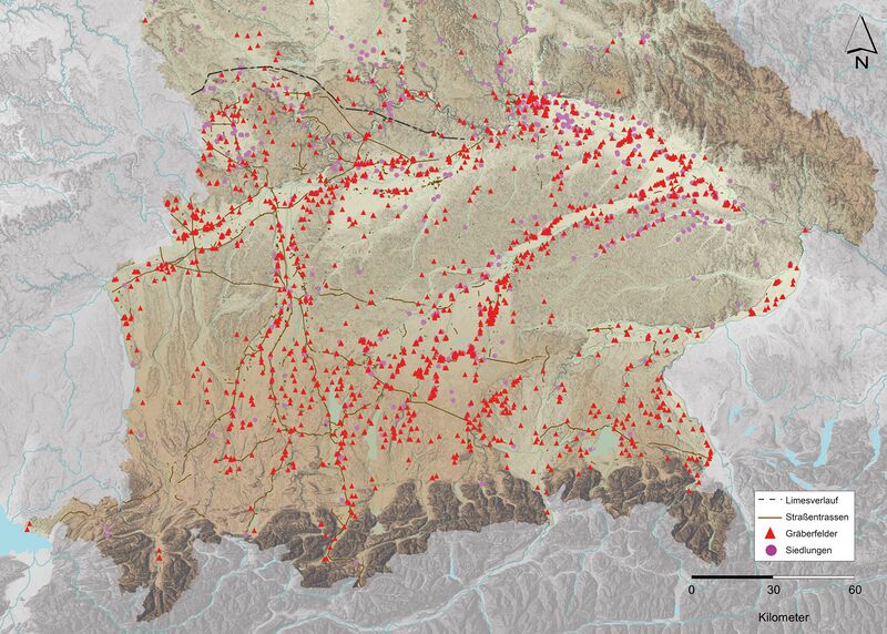 Abb. 6: Frühmittelalterliche Fundstellen im Süden Bayerns. Stand 2019 (Kartierung und Grafik: Jochen Haberstroh/Peter Freiberger, Bayerisches Landesamt für Denkmalpflege) HLB