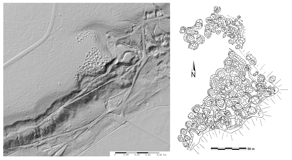 Abb. 7 – Schummerung und Vermessung des Trichtergrubenfeldes auf der Prügelleite bei Wehringen-Straßberg. (links: Geobasisdaten © Bayerische Landesvermessungsverwaltung)., rechts: M. Straßburger) HLB