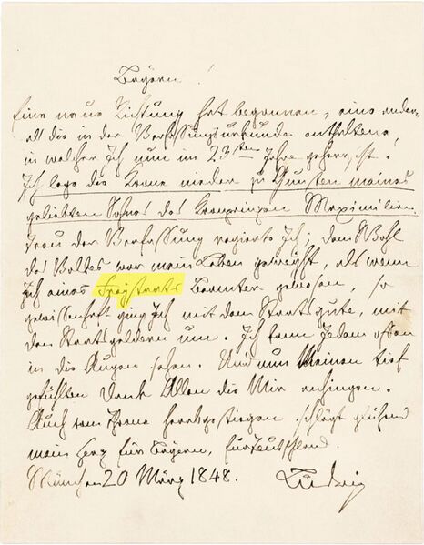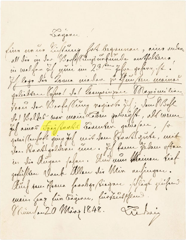 Thronverzicht Ludwigs I. vom 20. März 1848. Die Nennung "Feystaat" ist farblich hervorgehoben. (bavarikon) (Bayerisches Hauptstaatsarchiv, Staatsrat 1719)