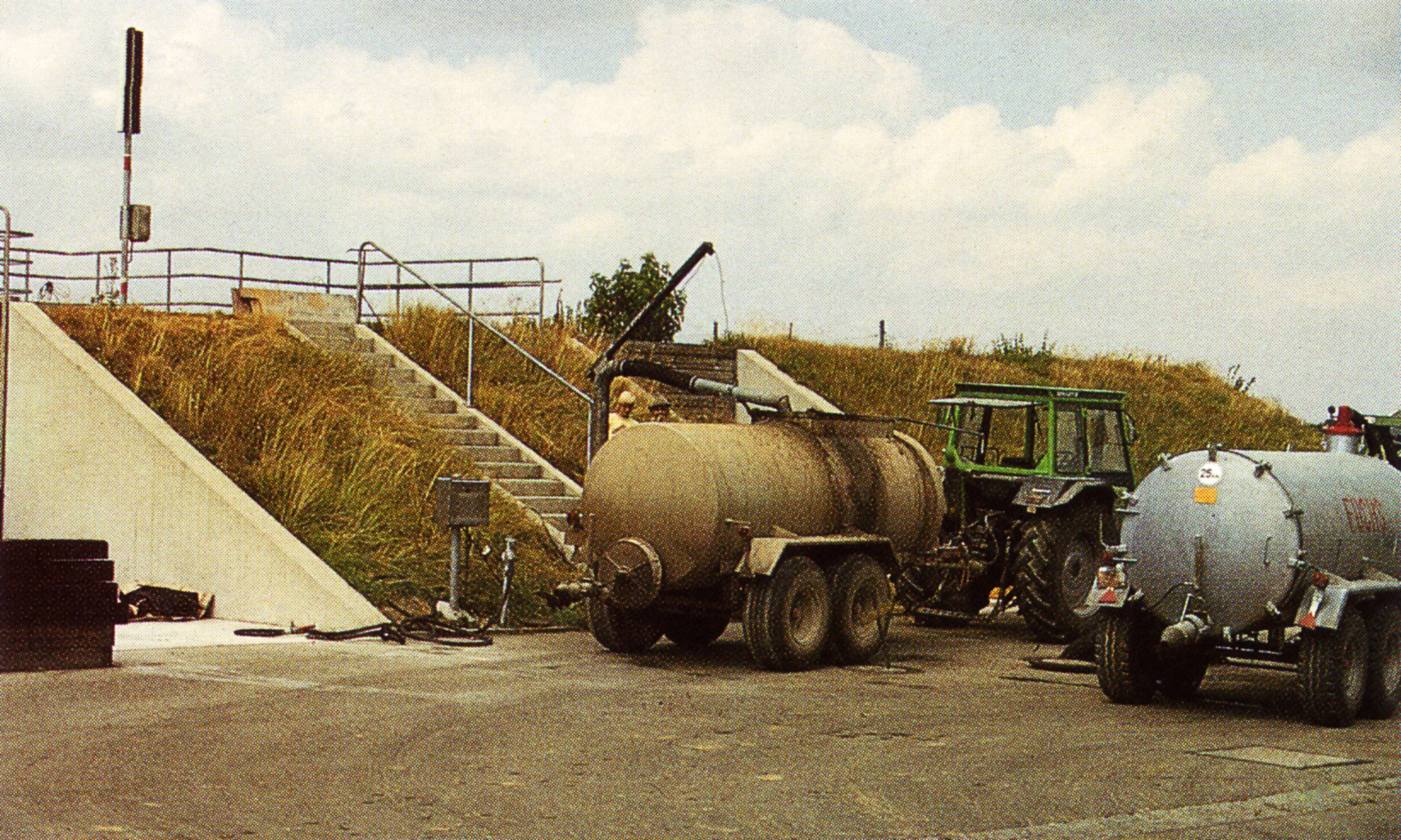 Abgabe von Nass-Schlamm aus dem Schlammspeicher einer Kläranlage zur landwirtschaftlichen Verwertung in den 1980er Jahren. (aus: Ludwig Strobel, Wasserwirtschaft in Bayern als Zukunftsauftrag und Herausforderung [Bayerisches Landesamt für Wasserwirtschaft, Heft 22], München 1988, 91; Foto: Peter Schleypen)