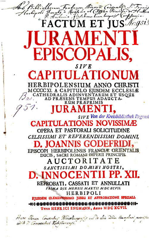 Abhandlung über die Wahlkapitulation Fürstbischof Johann Gottfrieds II. von Würzburg (reg. 1684-1698). Abb. aus: Heinrich Engmann, Factum et jus juramenti episcopalis […], [Würzburg] 1697. (Staatliche Bibliothek Regensburg, 999/Bav.951)