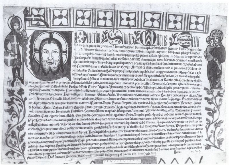 Illuminierte kuriale Sammelindulgenz: 1360, o. D., Avignon, "Splendor paterni luminis". Zwölf Bischöfe gewähren der Gemeinde der Filialkirche St. Georg in Immeldorf, Parrochie Sachsen bei Ansbach, Diözese Würzburg, jeweils 40 Tage Ablass für den Besuch der Kirche und ihrer Altäre an zahlreichen Tagen, Almosen und verschiedene fromme Werke. (Staatsarchiv Nürnberg, Rst. Nürnberg, Münchner Abgabe 1992, Urk. Nr. 1062) Urheberrechtlich geschütztes Werk, für die der Rechteinhaber aber die freie Verwendung erlaubt, wenn sein Name stets angeführt wird.