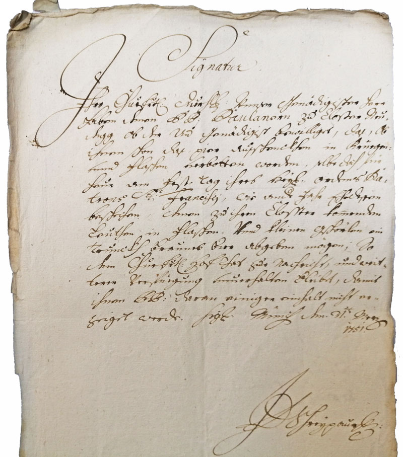 Abschrift der 1751 erteilten kurfürstlichen Genehmigung zum Ausschank von Braunbier am Namenstag des heiligen Franz von Paula im Paulanerkloster in der Au. (BayHStA Paulanerkloster Au Archivalien, 40, Prod. 50) HLB