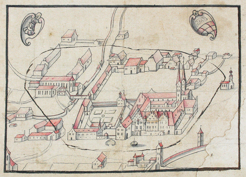 Plan der Abtei Kempten vor der Zerstörung im Dreißigjährigen Krieg, 1623. (Staatsarchiv Augsburg, Karten und Pläne F 54)