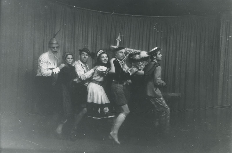 Kabarett "Achtung, Kurve! - Eine Dezember-Wies'n" der „Kleinen Freiheit“, Dezember 1951. Von links nach rechts: Rainer Penkert (1921-2012), Gertrud Kückelmann (1929-1979), Peter W. Staub (1910-2000), Renate Mannhardt (1920-2013), Hans Nielsen (1911-1965), Eva-Maria Meinecke (1923-2018), Oliver Hassencamp (1921-1988). Foto: Felicitas Timpe (1923-2006). (Bayerische Staatsbibliothek, Bildarchiv timp-023854) HLB