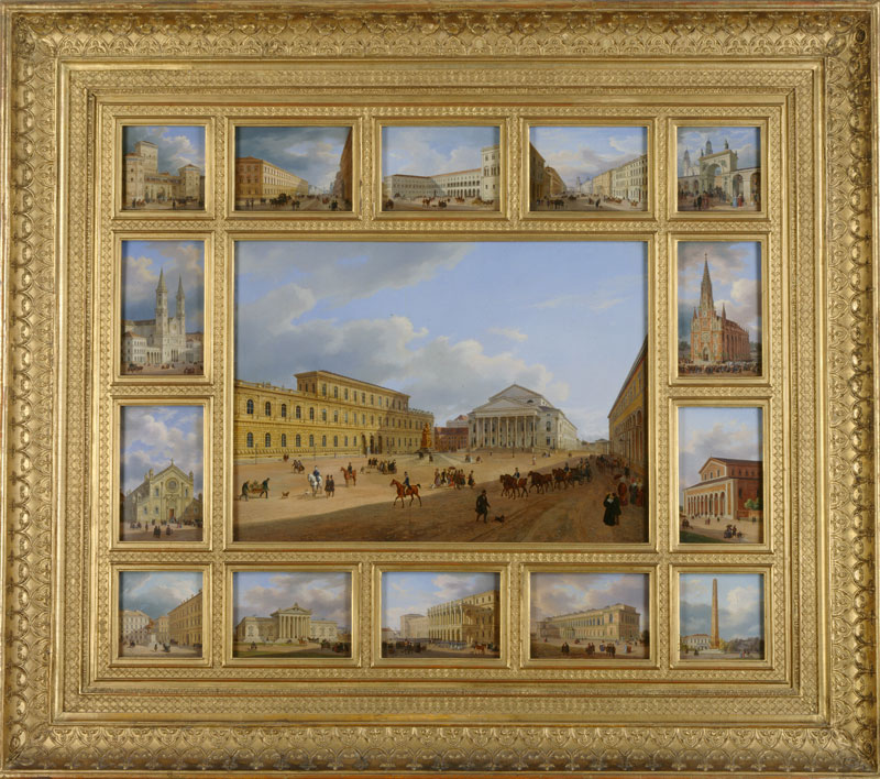 Das Gemälde "Das neue München" von Heinrich Adam (1787-1862) von 1839 verdeutlicht sehr gut die Bautätigkeit unter Ludwig I. in der Landeshauptstadt. Neben den einzelnen unter seiner Ägide entstandenen neuen Bautrakten der Münchner Residenz sind auch Museen und Kirchen auf den Seitenbildern dargestellt. (Münchner Stadtmuseum, Inventarnummer GM-28/562, lizenziert durch CC BY-SA 4.0) HLB