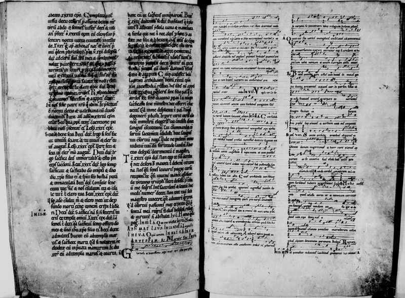 Afra-Offizium Hermanns des Lahmen aus der ersten Hälfte des elften Jahrhudnerts in einer Handschrift aus Prüfening von circa 1140 (Calendarium. Hieronymus ad Dardanum. Psalterium et cantica. Hymni. Missale cum notis musicis, BSB Clm 23037#Mikroform, fol. 239v-240r, Bayerische Staatsbibliothek, München, um 1140). (Bayerische Staatsbibliothek) HLB