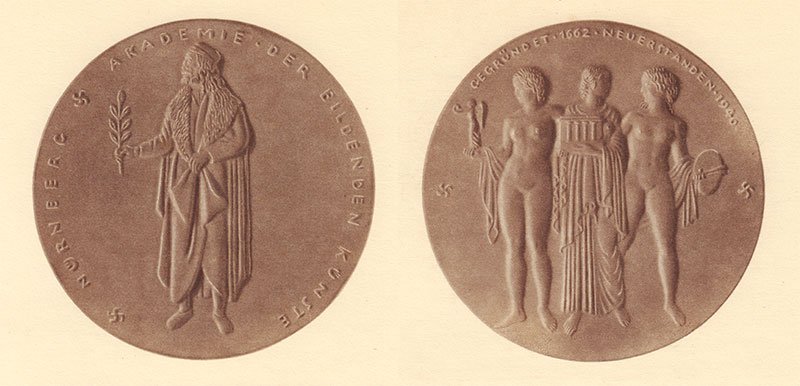Die von Wilhelm Nida-Rümelin (1876-1945) geschaffene Plakette der Akademie der bildenden Künste feiert die Rückgewinnung des Akademiestatus 1940. Abb. aus: Eberhard Lutze (Bearb.), Die Akademie der Bildenden Künste in der Stadt der Reichsparteitage Nürnberg, Nürnberg 1940, Titelblatt u. [S. 2]. (Bayerische Staatsbibliothek, 4 41.432)
