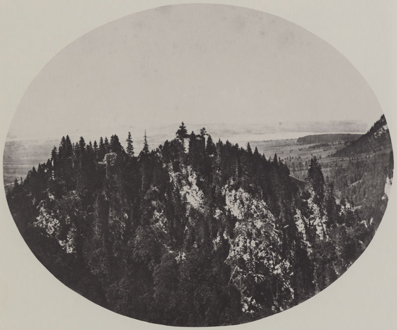 Burgfelsen mit den Ruinen der ehemaligen Burg Vorderhohenschwangau. Von der Marienbrücke aus von Joseph Albert (1825-1886) um 1860 fotografiert. (gemeinfrei via zeno.org) HLB